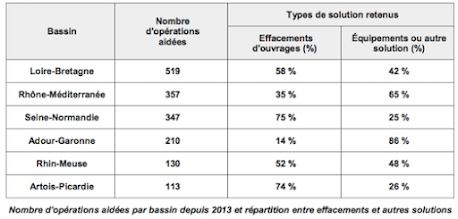 Quatre bassins donnent une claire priorité à l'effacement des ouvrages hydrauliques : Seine-Normandie (75%), Artois-Picardie (74%), Loire-Bretagne (58%) et Rhin-Meuse (52%). Le bassin RMC est à 35% et non 25%. Il se trouve que les bassins Seine-Normandie, Artois-Picardie et Loire-Bretagne sont ceux qui ont classé le plus grand linéaire de rivières et donc le plus grand nombre d'ouvrages.